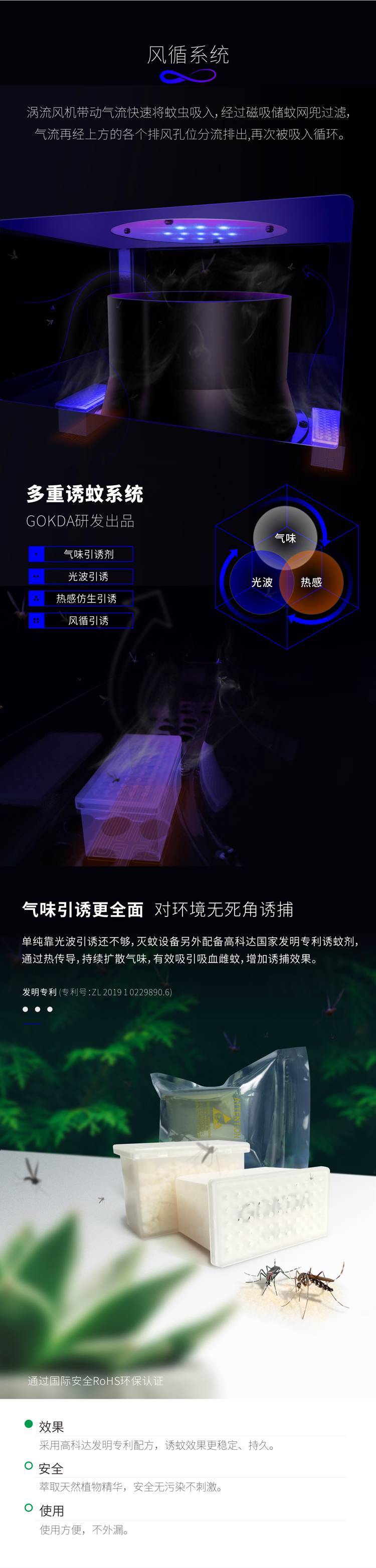 GOKDA可移动式户外太阳能灭蚊机,多重诱蚊新技术集合于一身,仿生诱蚊气息、温度模拟、光波吸引特定蚊种(白纹伊蚊),灭蚊过程安全、环保。