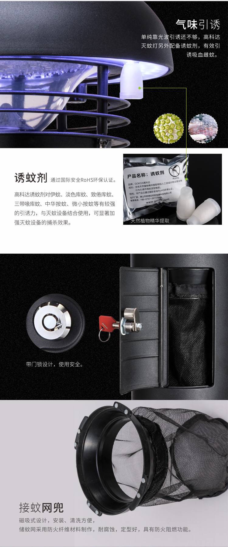 高科达GOKDA户外灭蚊灯风吸式灭蚊,使用全金属机身,工业设计造型美观,具户外照明、灭蚊、环境装饰一体化功能。运用生物诱蚊技术和物理灭蚊设备,花园灭蚊虫采用诱蚊光波 蚊虫信息素气味 体温模拟引诱蚊虫靠近,高速旋转的涡流风机将蚊虫吸入储蚊盒并风干至死,安全。从而达到绿色除虫、环保灭蚊的目的。