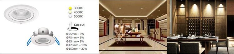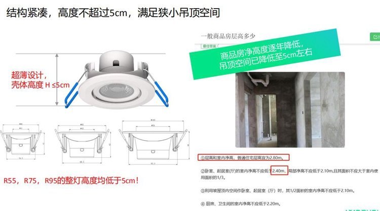 1、结构紧凑,超薄设计:灯具高度不足5cm(3W,6W,9W) ,满足狭小吊顶安装。