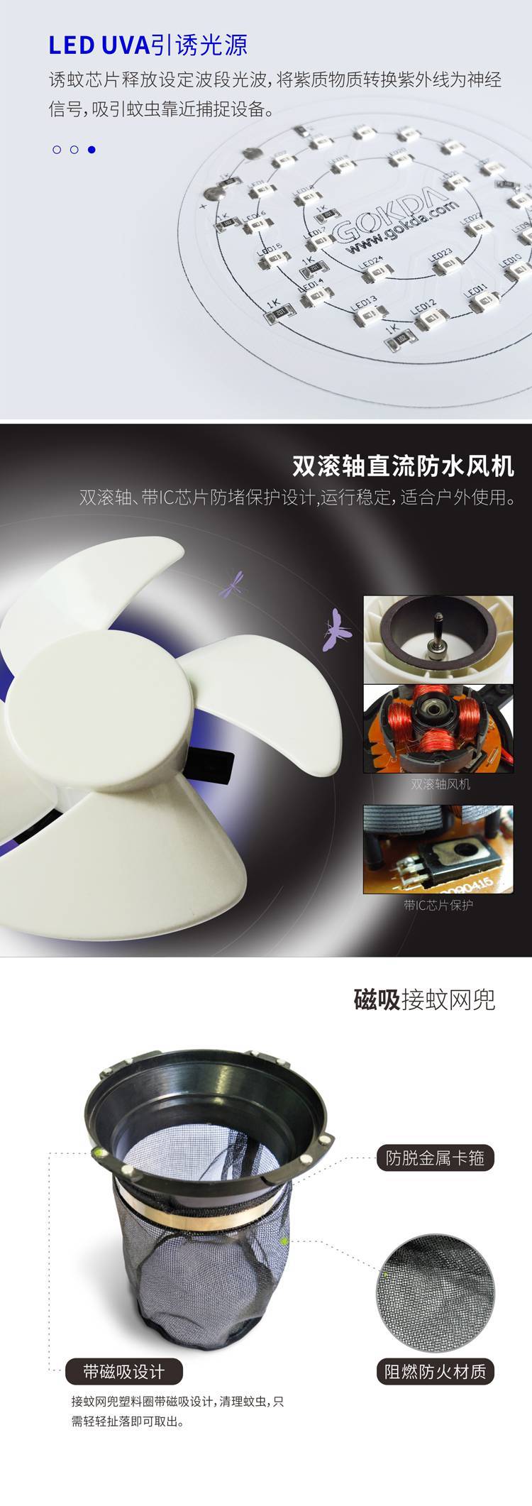 1、采用GOKDA研发多重诱蚊系统(专利气味引诱/光波引诱/热感仿生引诱/风循引诱)。