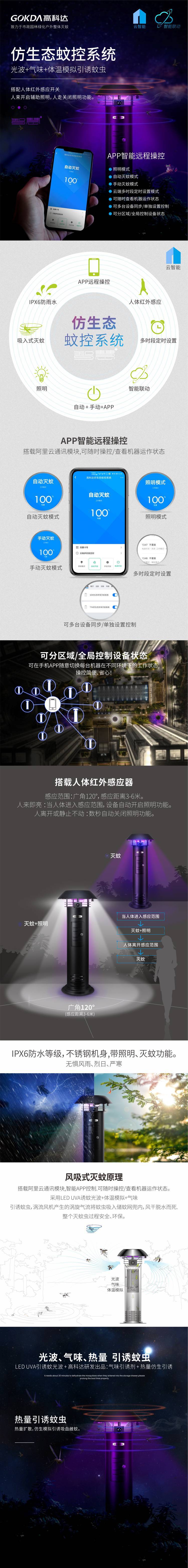 GOKDA高科达智能蚊控系统运用生物诱蚊技术和物理灭蚊设备,采用LED UVA光波引诱 气味引诱 人体热感引诱蚊虫靠近,高速旋转的涡流风机将蚊虫吸入储蚊盒风干脱水而死。整个过程安全无污染,无毒副作用。从而达到绿色除虫、环保灭蚊的目的。