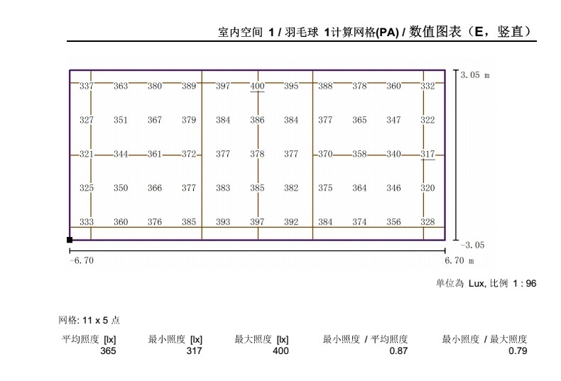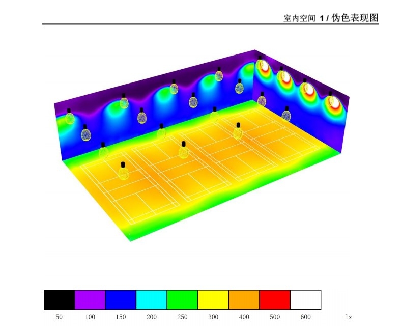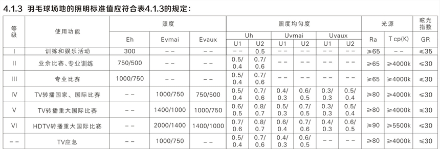 一般来讲垂直照度应大于1/2的水平照度,当垂直照度等于水平照度时,运动的环境最 理想。羽毛球场照度要求如下表: