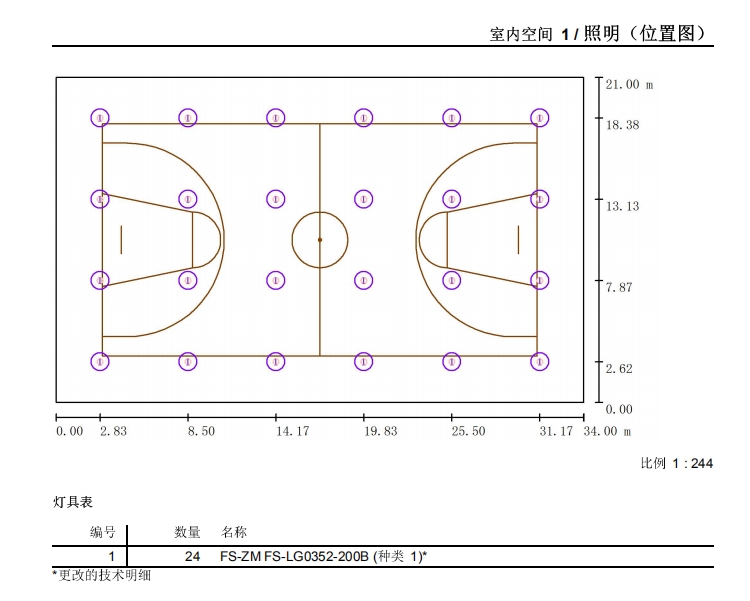 本方案设计使用24盏FS-LG0352-200W风顺启明体育馆LED天棚灯(平均照度552lx,可满足业余比赛标准)