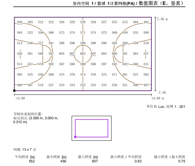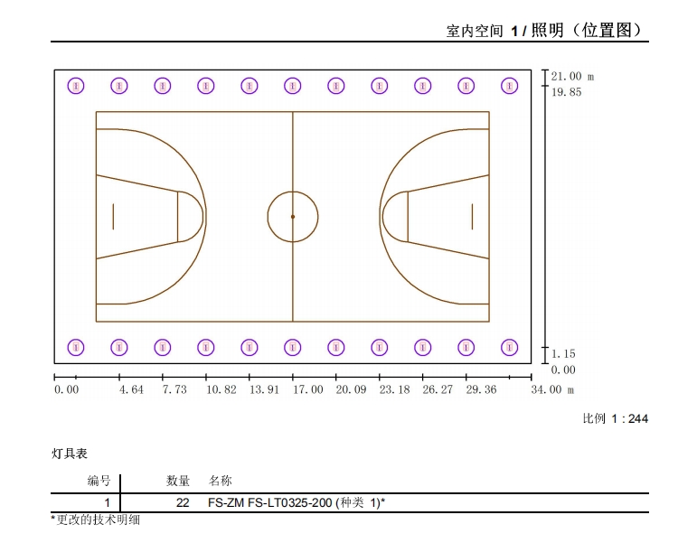 本方案设计使用22盏FS-LT0325-200W风顺启明体育馆LED投光灯(平均照度557lx,可满足业余比赛标准)