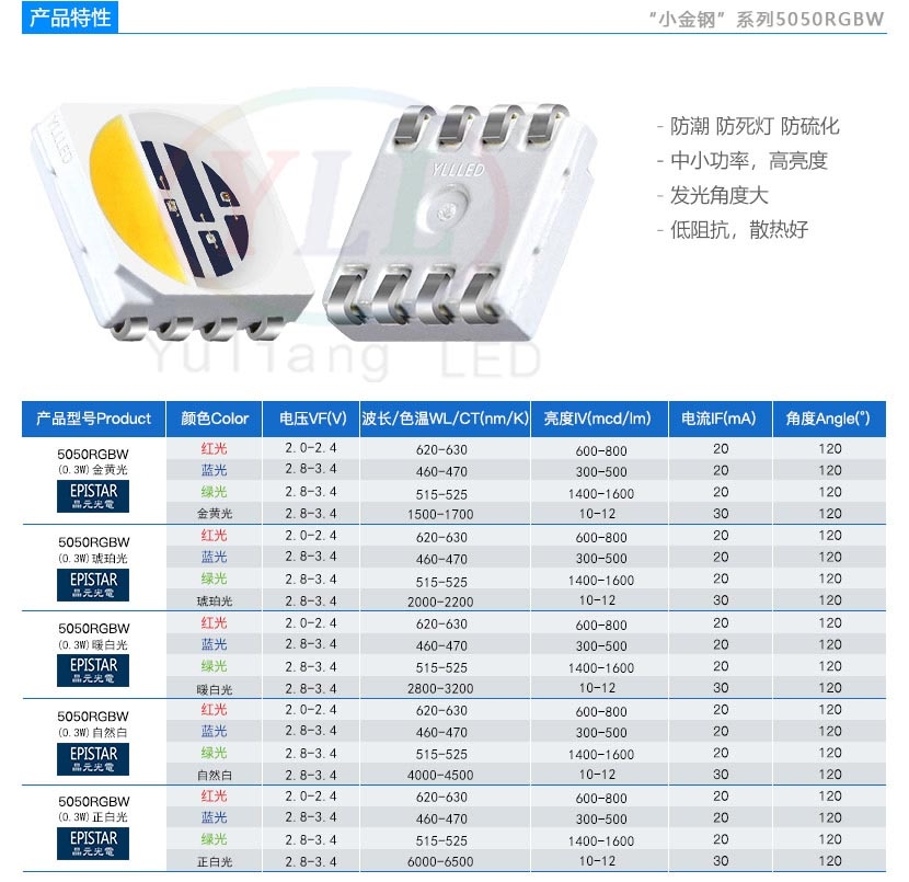 小金钢系列5050rgbw LED灯珠规格:功率0.3W