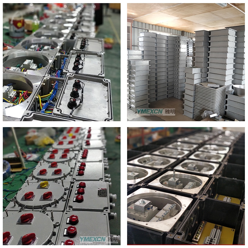 因此这些产品也划归到这类产品中来,防爆配电箱一般均为复合型结构,由外壳采用增安型结构,内装元件采用隔爆型元件或增安型的元件,或一个隔爆型主腔内装各种元件,或两种结构结合成一体:外壳采用ZL102铝合金压铸成型,表面高压静电喷塑,不锈钢外露紧固件。