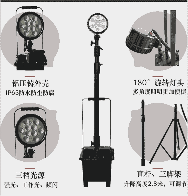 灯头采用全密封一体式设计,可固定在箱体或其它支撑物上使用,也可卸下手持式使用,照明角度可任意调节,一体式升降杆结构,灯头可在1.2米~3米高度范围内任意升降。 分体式三脚固定架,灯头可在1.2米~2.8米高度范围内任意升降。