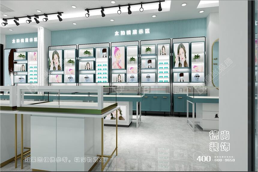 3.贴木皮眼镜展示柜,多用于中低档眼镜店装修中,板材选用密度板或夹板材质,表面直接贴木皮,使用白乳胶黏贴,然后使用清漆涂装以保护木纹。工艺简单价格也便宜,大面积曲面木纹效果自然。