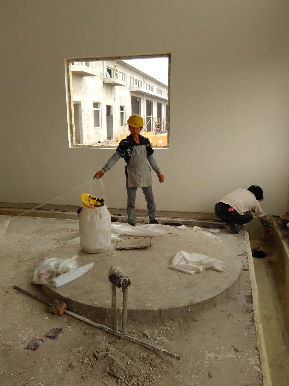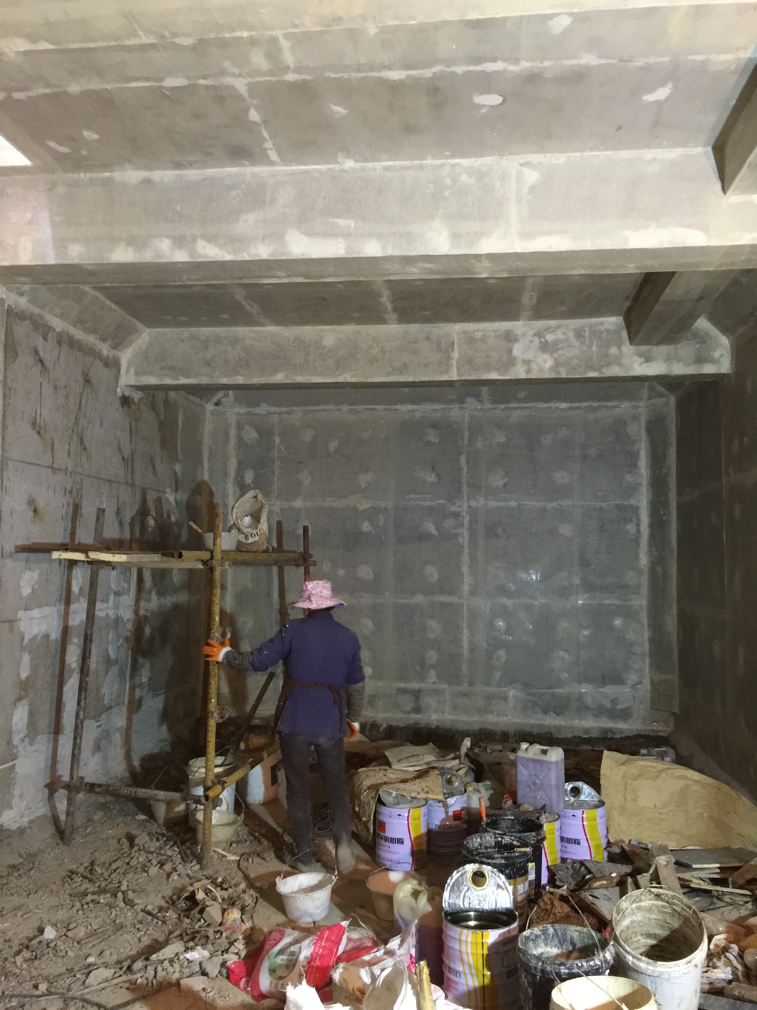 工作从业人员应严格遵守和配合总施工单位制度和工作,服从现场进度作工艺流程:搭设跳板、脚手架——→基面清理—→基面修缮—→基面彻底烘干——→基面环境温湿度检测——→管口阴阳角做附加层—→刷底涂二遍—→预铺纤维布——→涂刷环氧二层——→预铺纤维布——→涂刷环氧二遍—→检验及完缮——→养护固化基面处理,用研磨机将基面打磨拉毛,除去水泥部分再清除浮尘,清洗基面,完全干燥后刷底涂一遍底涂采用环氧树脂。