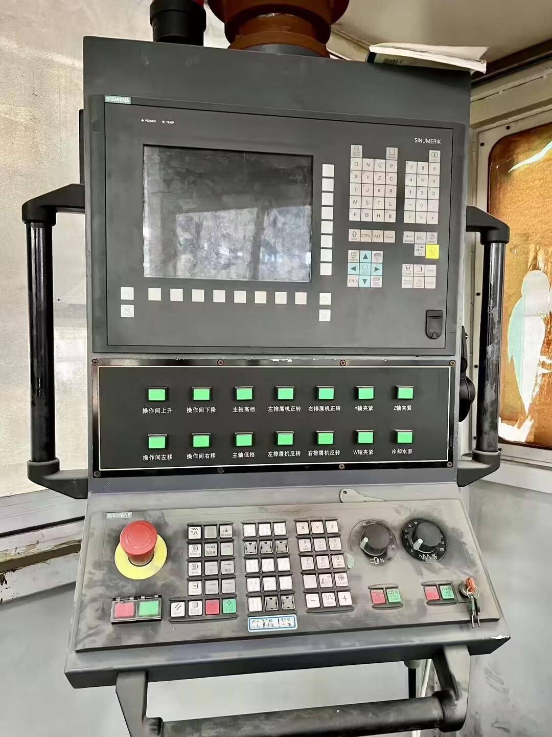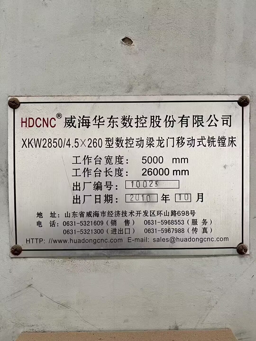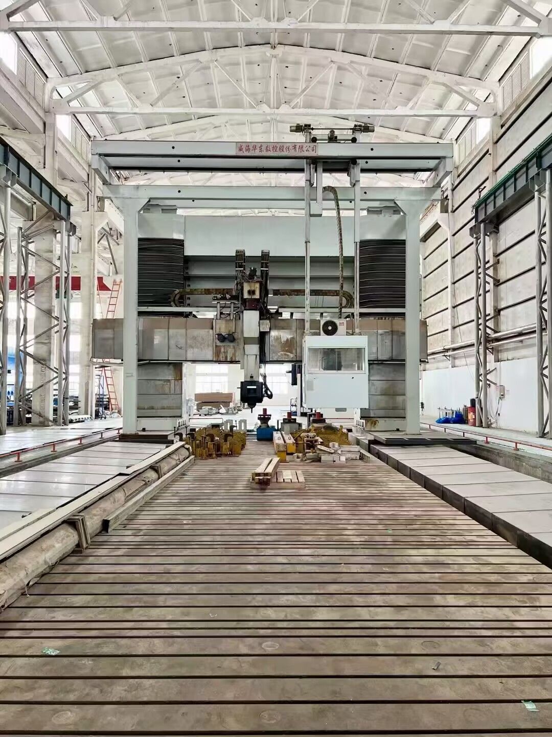 工作台尺寸:5000*26000mm梁立柱间距离:6300mm固定工作台承重25吨平方米,龙门框架移动:27米镗铣头水平移动7.3米镗铣头垂直移动:1.25米活动横梁垂直移动3.3米镗铣头主轴端面距离工作台端面距离4.5米机床整体重量约528吨,机床外形尺寸:40500*14200*9800mm