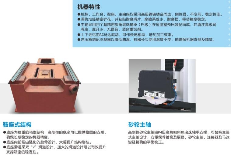 3.1.机柱、工作台、鞍座、主轴座均采用高级铸铁铸造而成,刚性强、不变形、稳定性佳。