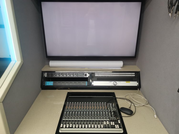 技术区5组机柜(含2组强冷机柜),导播区双层6台55监视器,导播监看一目了然,导播桌可电动平移,满足导播的随性需求,音频区独立吊机柜,