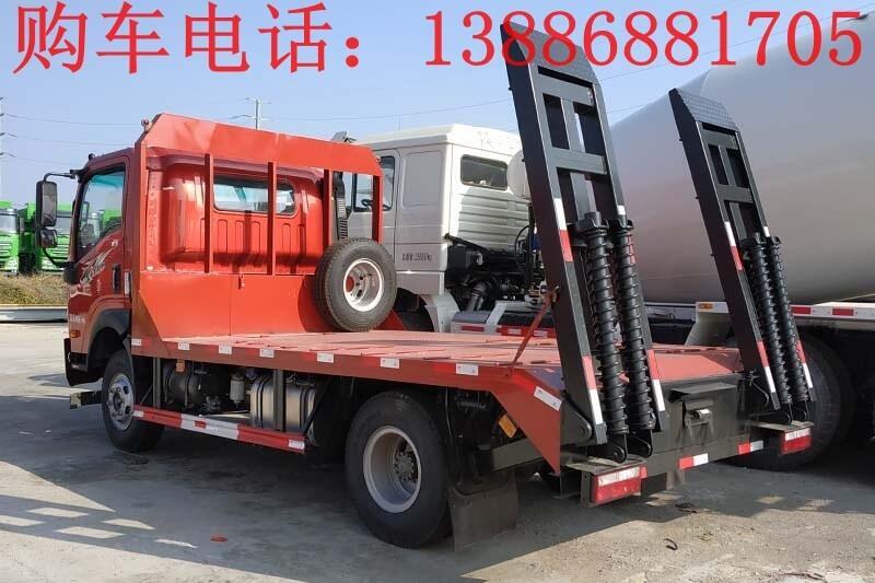 5吨挖机平板拖车在哪买上装配置: 锰钢材质、板面无镂空,横梁采用100*100方管,间距25公分,面板采用4mm厚花纹板,板面设防滑钢条,车尾双弹簧加强型爬梯,便于工程车上下安全,斜坡带后支腿,。