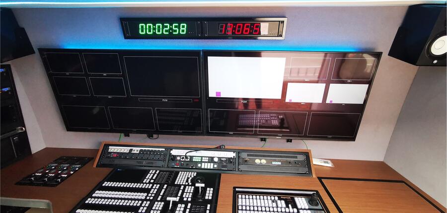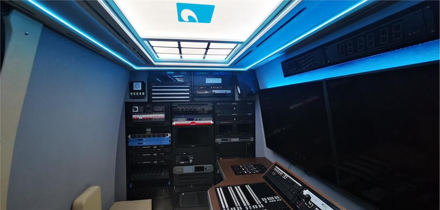 总体布局的设计:在保证基本设备容纳的前提下,在保证好的操作性、维修性的基础上,尽量留有一定的空间,用于扩展;车内分为三个大区:前、中、后依次为驾驶区、直播工作区、设备区。车内布局按照6讯道设 计,导演技术音频工作区、录制区、合理分布。充分考虑车内工作人员操作方便和交流,尽量减少车内工作人员的交叉流动。工作区沿用原车右侧的侧滑门,直播区包括工作台面(内嵌调音台、切换台)、高级工作座椅3套。设备区设置三组19″标准机柜、双层电动电缆盘,设备区,从车后开门。