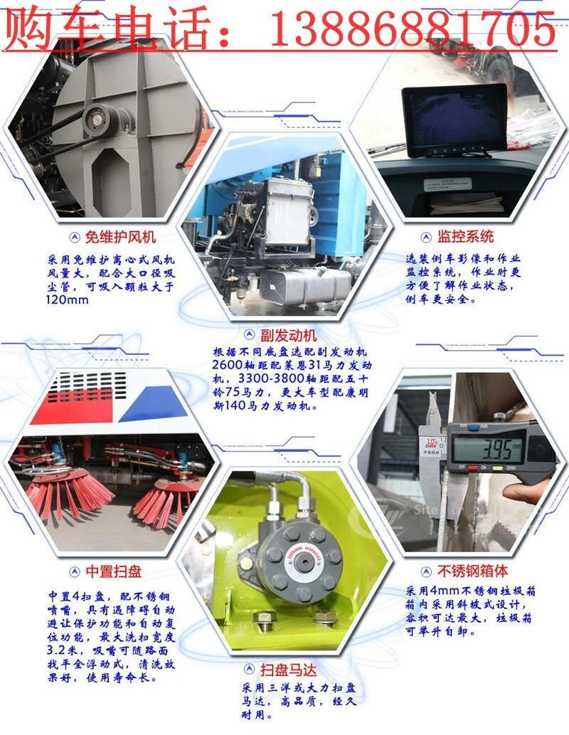 7.采用先进,高效的专用风机和可随路面自动找平的全浮动式吸嘴,清扫效果好,使用寿命长。上装标配:带4个扫盘、江铃副发动机、三洋马达、施耐德控制开关、海普瑞斯电磁阀组、无级变速自动离合器、免维护离心式自动风机、不锈钢垃圾箱、尾部LED箭头指示灯、手动泵应急系统、中联北极星电子水泵,垃圾举升自卸功能。