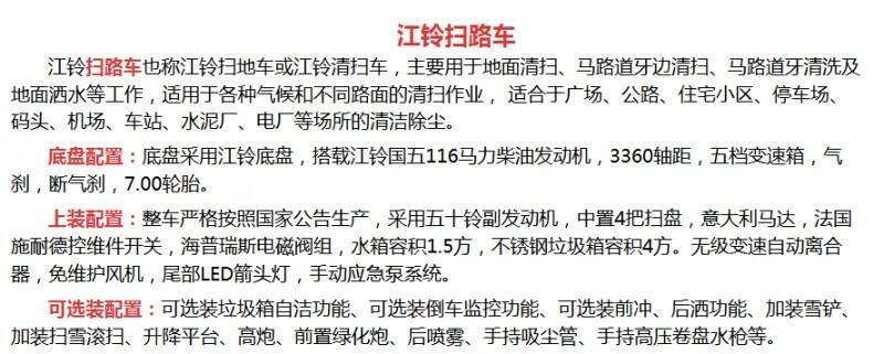 12方扫路车价格上装标配:带4个扫盘、江铃副发动机、三洋马达、施耐德控制开关、海普瑞斯电磁阀组、无级变速自动离合器、免维护离心式自动风机、不锈钢垃圾箱、尾部LED箭头指示灯、手动泵应急系统、中联北极星电子水泵,垃圾举升自卸功能。