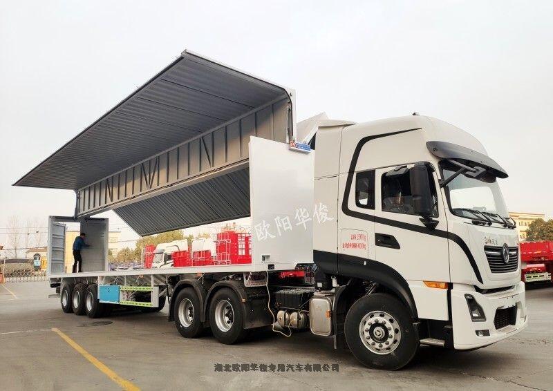 欧阳华俊飞翼半挂尺寸为:13.75米长×2.55米宽×4米(离地高),开启方式为:全飞式,采用进口动力单元,盐城油顶,车厢采用内封镀锌板,外挂瓦楞板,顶部加防水篷布,带防水槽,底板采用花纹板,外表防滑,美观耐用,货物运输安全可靠。