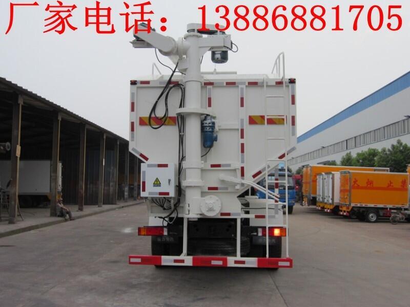 上装配置: 罐体可根据用户要求做多个独立分仓,可以独立控制各分仓卸料顺序和速度。罐体材质采用4mm优质碳钢板,整车3条绞龙,有3个5.5KW电机(万邦 西门子)带动,顶部绞龙液压控制举升,可左右旋转180°,罐体可根据用户要求做多个独立分仓,可独立控制各分仓卸料顺序和速度,卸料管倾斜60度,垂直卸料高度8.5米,整车卸料完用时20分钟。