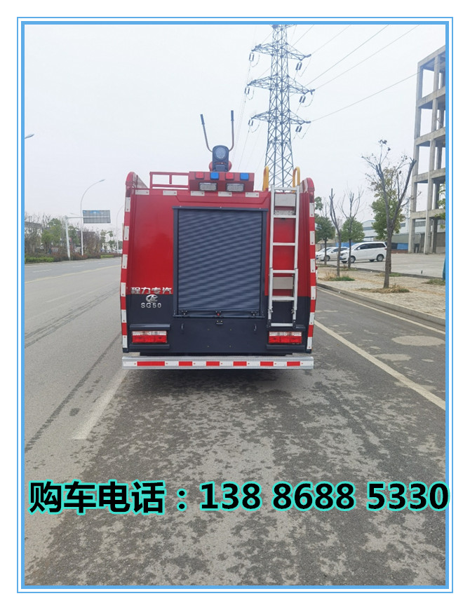 随底盘选装驾驶室,选装红色爆闪灯。水罐容积为4.800立方米,水罐为一异型罐,前端尺寸:1220×1120×1220mm,后端尺寸:1310×2100×1220mm。整体式侧防护结构,后防护装置材料:Q235A,截面尺寸:80×125mm,与车辆连接方式:螺栓连接,后防护离地高度:390mm,ABS生产企业为襄阳东风隆诚机械有限责任公司,型号为ABS/ASR-24V-4S/4M。主要专用装置有消防泵、消防炮。灯具仅在作业时使用。选装后部带拉梯架装置。