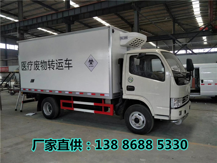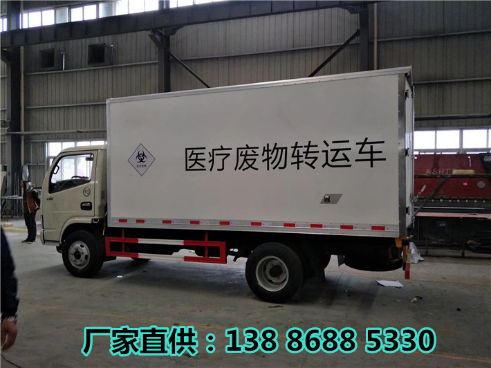 该车为危险货物运输车辆,运输感染性物质,类项号6.2;厢体顶部封闭,不可开启;整车长(mm)/货箱内长(mm)/轴距(mm)/后悬(mm)的对应关系:9995/7680/5600/3135,9150/6800/5300/2590,8995/6700/5300/2435,8650/6300/4700/2690,8600/6300/4700/2640;侧防护材质为Q235,连接方式为焊接加螺栓连接,后防护材质为Q235,连接方式为螺栓连接,后防护装置断面尺寸为(mm):φ120,离地高度:490mm;选装不带压夜尾板时,后防护材质为Q235,连接方式为焊接连接,后防护装置断面尺寸为(mm):120×60,离地高度:490mm;EBS型号/厂家:EBS/ESC-d/襄阳东风隆诚机械有限责任公司;仅采用子午线轮胎,排气管前置,安装限速装置(限速80km/h).安装具有卫星定位的行驶记录仪,转向轮装备轮胎爆胎应急防护装置,后轴仅采用空气悬架,选装直接供电式ETC车载装置;发动机型号及油耗值(L/100km)分别为:B6.2NS6B230(26.7),D4.5NS6B220(26.6),YCS04200-68(26.4),CY4SK761(26.8),D4.5NS6B240(25.60),B6.2NS6B260(25.13);安装液压尾板时,起重尾板收起状态的水平长度为260mm,尾板总质量为450kg;随底盘选装驾驶室、电瓶、尿素罐、储气筒、油箱、后处理、排气管、后组合灯不同样式外观;选装箱体外观及机组样式;选装不带尾板样式及尾板厂家.