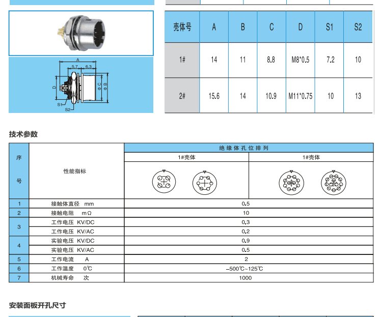 六、根据不同大小插座安装开孔尺寸及具体芯数(各种多芯类都可以生产,可根据客户要求特殊定制):