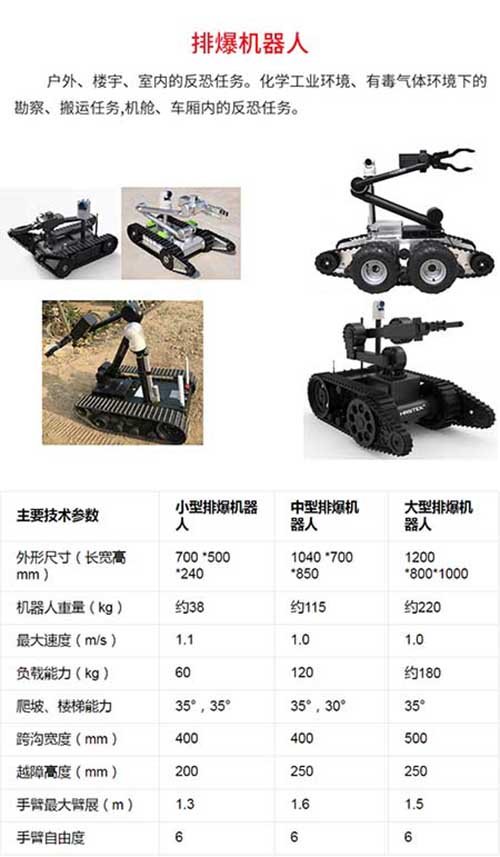 配备有机械臂的排爆机器人为爆炸物处理提供了的方案。爆炸物处理是使危险爆炸装置安全接除的过程。安全地检查到危险易爆物品,例如自制炸弹,管道炸弹,压力锅等,并使用机器人的操作员可与爆炸物区域保持安全距离处置易爆物品。