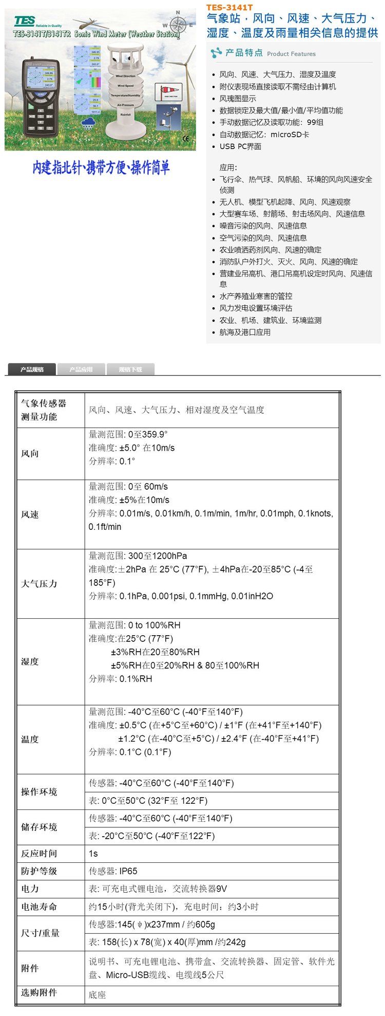 泰仕TES-3141T手持式气象站风向风速大气压力湿度温度风速风向仪