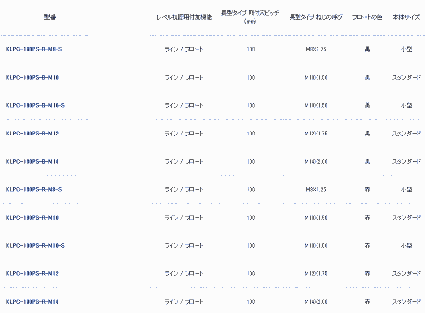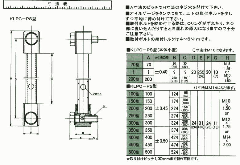 ?KLPC-PS型は本体に耐熱性 耐薬品性に優れたPPS樹脂、ゲージ管にPSF(ポリサルホン)樹脂、パッキンにエチレンプロピレンゴム(EPT)、取付ボトルにSUS304を採用し、温水とアルカリ性液等に適応したオイルゲージです