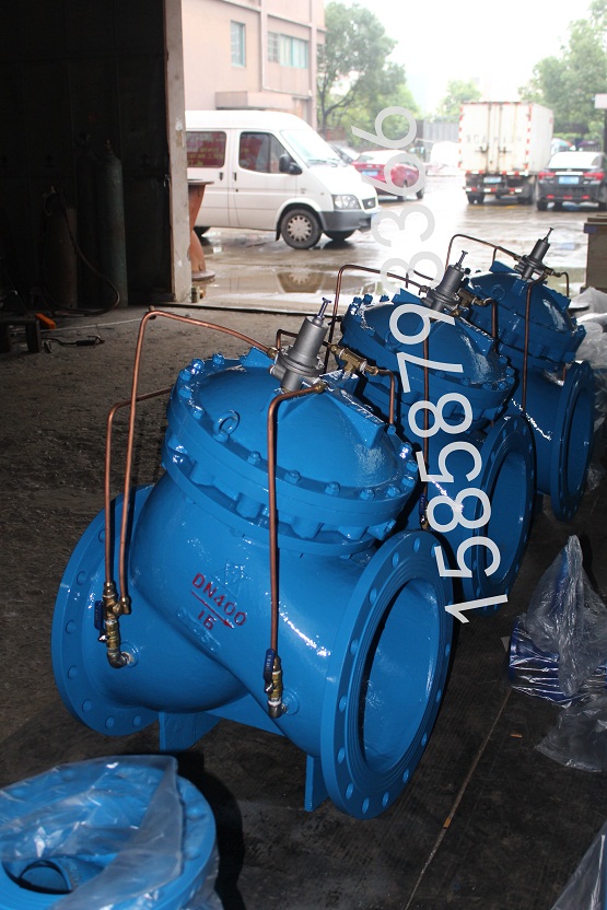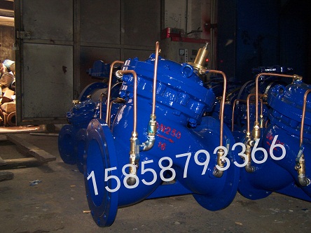 水力控制阀就是水压控制的阀门,是由一个主阀及其附设的导管,导阀,针阀,球阀及压力等组成。根据使用目的,功能及场所不同演变成水力控制阀,遥控浮球阀,减压阀,流量控制阀,缓闭式止回阀,泄压阀,水力电动控制阀等。水力控制阀分为隔膜型或活塞型两类,工作原理相同,都是以上游压力差△P为动力,使隔膜(活塞)液压式差动操作,完全由水力自动调节,从而使主阀阀盘完全开启或关闭处于调节状态,当进入隔膜(活塞)上腔控制室内压力水被排到大气和下游低区域时,作用在阀盘底部或隔膜下方的压力值大于上方压力值时,所以将阀盘推动完全开启开启位置,当进入隔膜(活塞)上腔控制室内压力水不能排到大气或下游低区域时,作用在隔膜(活塞)上方压力值大于下方压力值,所以就会把主阀盘压到完全关闭的位置,当隔膜(活塞)上腔控制室压力值处于入口压力和出口压力中间时,主阀盘就处于调节状态,其调节位置取决与导管中的针阀和可调导阀联合控制作用。可调导阀可以通过下游出口压力并随它的变化开大或关小其自身的小阀口,从而改变隔膜(活塞)上腔室的压力值,控制主阀阀盘调节位置。