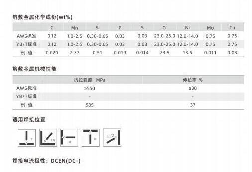 熔敷金属为含22Cr-12Ni的稳定奧氏体组织,其中含有一定的铁素体组织,含碳量低,抗裂性佳,焊接性优异。适用于低碳不锈钢和覆面钢,SUS309S. 耐热13Cr.18Cr钢或异种金属的焊接。