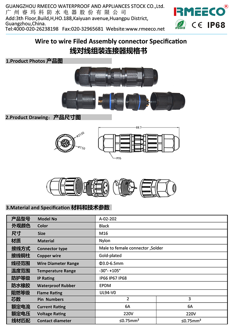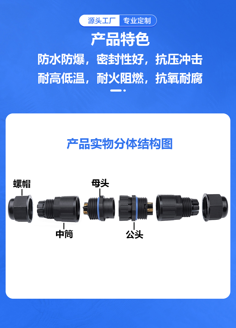 m16尼龙焊接2芯公母转接航空头快速户外大功率电缆直通防水连接器