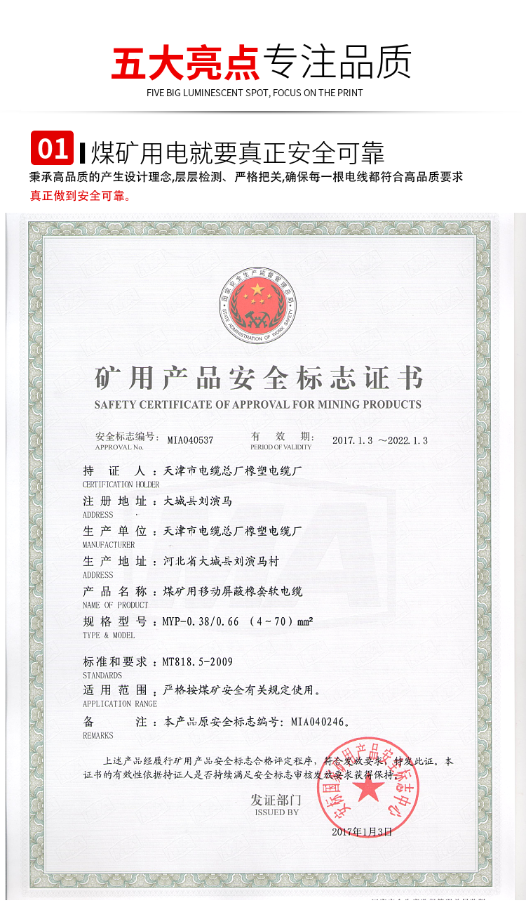 矿用移动橡套软电缆MYP 采煤机移动线 MCP 380/660v 纯国标屏蔽线 用途 | 抗磨抗屏蔽电缆 | ||