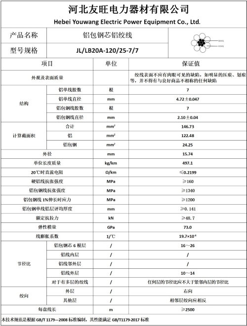 四、铝包钢芯铝绞线生产厂家JL/LB20A-120/25价格产品参数及样本图片: