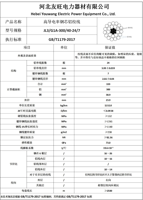 四、JL3/G1A300/40高导电率导线生产厂家产品基本参数及样本图片:如下图表