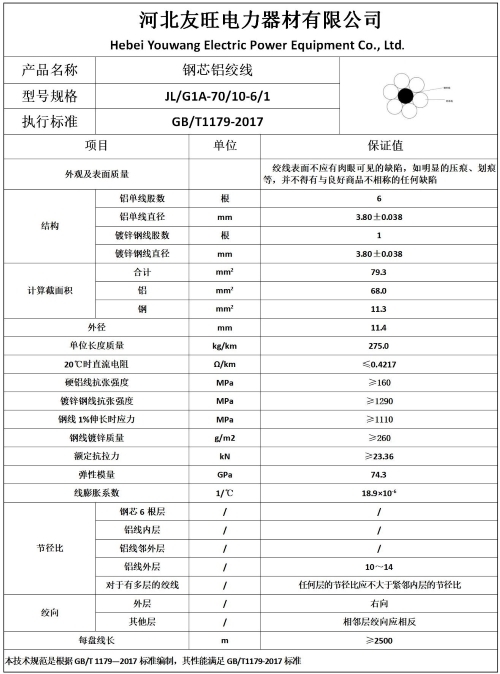 四、JL/G1A70/10钢芯铝绞线厂家国标生产型号齐全产品基本参数及样本图片:
