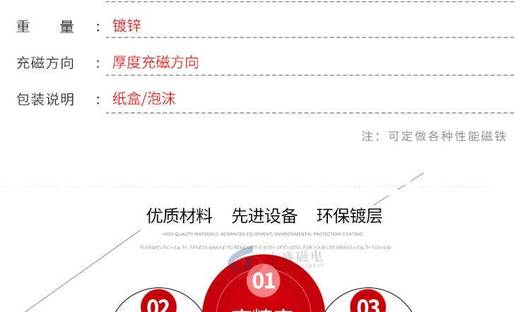 2.磁铁在储存时要保持室内通风干燥,否则潮湿环境容易使磁铁产生锈蚀。环境温度不要超过磁铁最大工作温度。未电镀的产品存放时可适当涂油防锈,充磁产品存放应当远离磁盘、磁卡、磁带、计算机显示器、手表等对磁场敏感的物体。磁铁材质较脆,运输、电镀(涂镀),安装过程中,应确保磁铁不受剧烈撞击,如果方法不当,可能会引起磁的破损、崩裂,磁铁充磁状态运输时应该屏蔽,特别时航空运输一定要彻底屏蔽。
