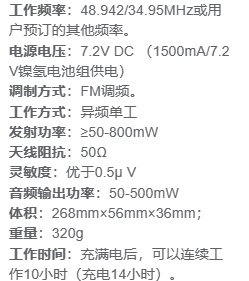 工作频率48.942/34.95MHz或用户预订的其他频率