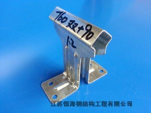 支架材质为热镀锌的,也有不锈钢的,常规高度55mm,宽度65mm 支架的厚度一般是:1.0-1.5mm,实卡厚度会存在一定的误差;如果客户有特殊要求厂家会根据客户要求相应的增加厚度;开口度有两种,小开口18.5mm,大开口23.5mm,选购买时根据彩钢瓦的型号,棉的材质,棉的厚度,开口度进行选购。