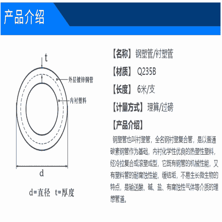 我公司生产的管材现已广泛应用于工业、民用给排水系统,循环水系统,去离子纯净水系统,耐磨防腐系统,防结垢抗菌防腐系统,内外防腐系统,电缆护套,消防喷淋系统,发泡保温防腐系统,化工重防腐系统等,并且和国内外多家单位建立了长期供货合同。我公司长期长期承接各类涂塑钢管,衬塑钢管,PSP钢塑复合管,pe管等建筑管材及管件,规格齐全,支持定制,库存充足,现货速发.因为公司有自己的工厂,我们是集生产、销售为一体的新型科技公司,所以可以省去中间商赚差价,从源头上为您省掉差价,并且我们一直秉承薄利多销,产品保值的原则,所以在保证品质的情况下争取给到客户行业的低价,并且遵循量大更优的方针,得到了很多新老客户的认可。质量先行,价格从优是我们的,宗旨,期待各位新老客户来电洽谈合作。