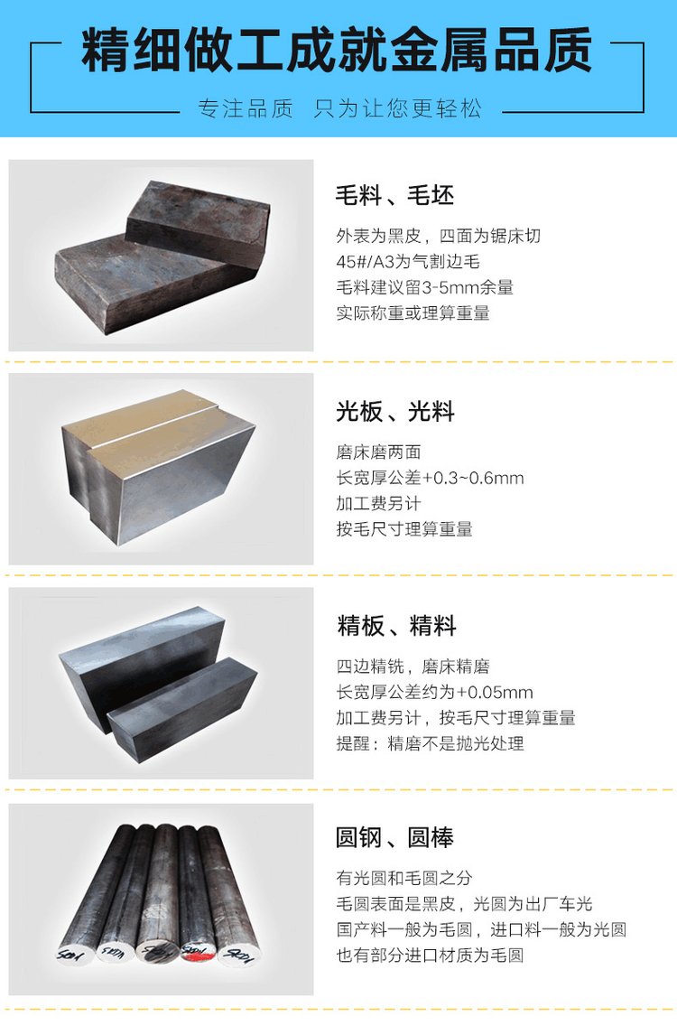 ·光料、精料材料单件重量不足5KG,在正常报价基础上,另收取小件铣磨费12元/件(大件薄板除外);