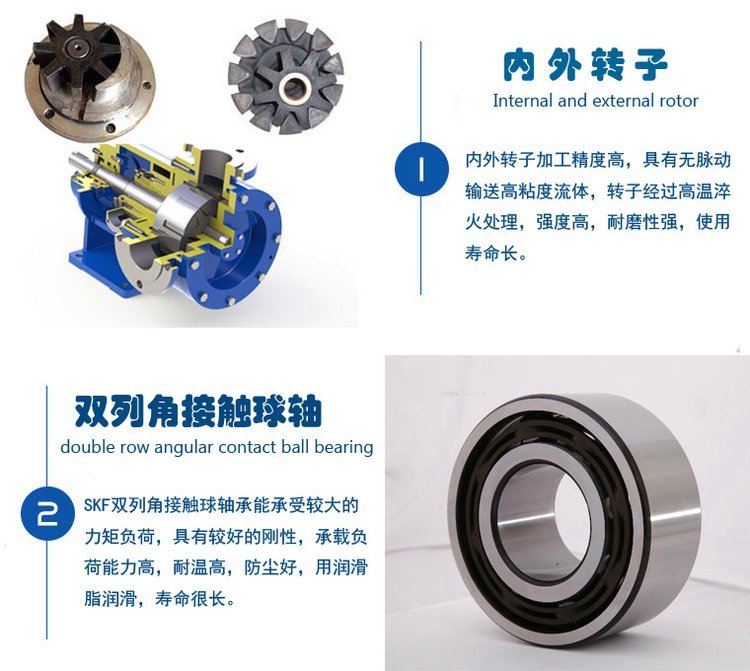 高粘度泵是容积式内啮合齿轮泵,主动齿轮(外转子)带动被动齿轮(内转子)旋转时,不断产生封闭的空间,在吸油区齿轮逐渐脱离啮合而液体不断地充满齿间并被带到出油区,齿轮在出油区进入啮合时液体被排出。两个旋转齿轮的共同作用,形成一个稳定的体积排量,没有脉动。由于泵是完全对称的,泵可以反转,液流方向也随之改变。但应注意,泵的转向可能受到密封或泵内其它结构的限制,用户有反转要求时应在订货时做出说明。