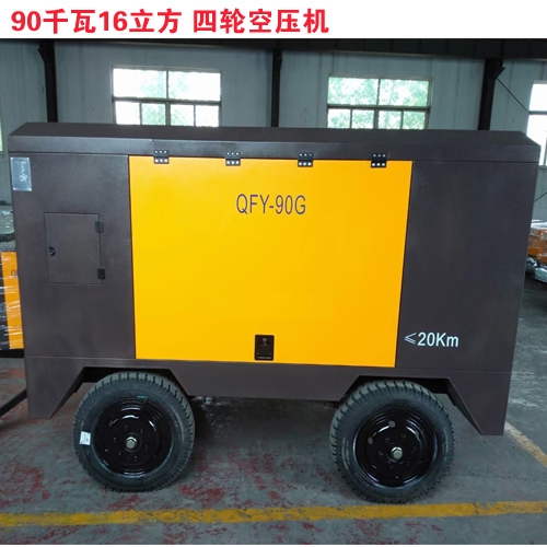 型号:QFY-90G,驱动方式:直联,电机功率:90千瓦,排气量:16立方每分钟,工作压力:8-13公斤,外形尺寸:2850*1460*1870,重量:1800公斤,四轮移动带牵引,内部自带缓冲罐,工地基坑支护、喷浆螺杆空压机。