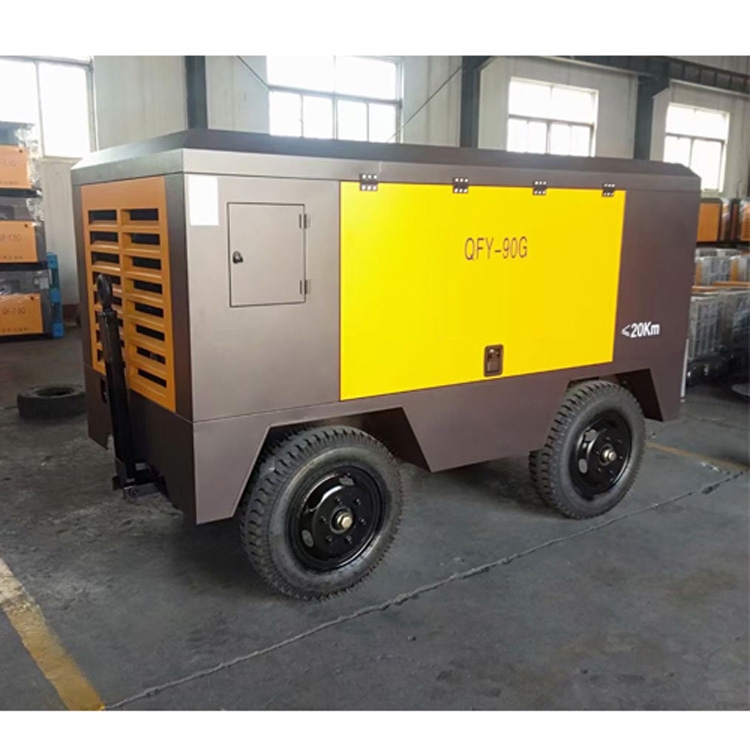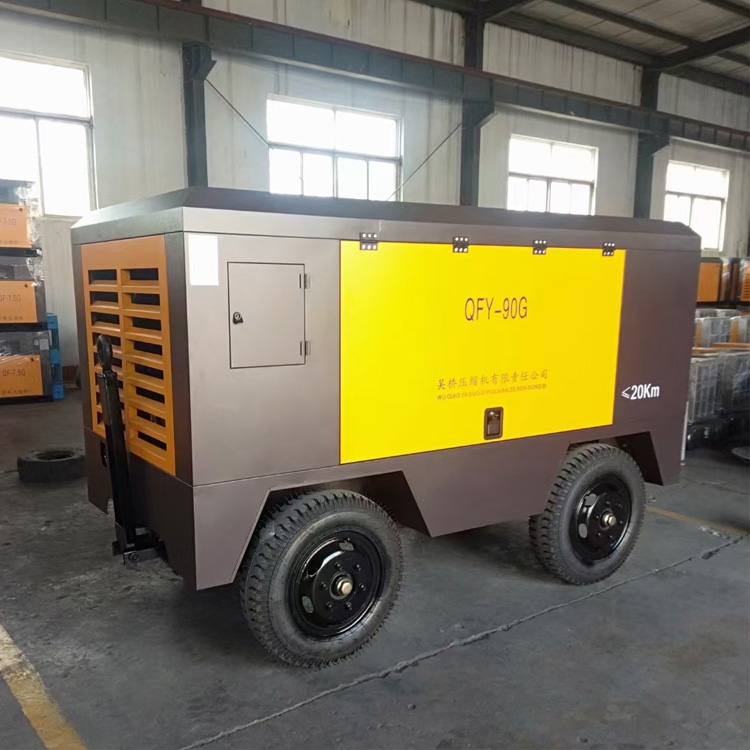 型号:QFY-75G,驱动方式:直联,电机功率:75千瓦,排气量:13立方每分钟,工作压力:8-13公斤,外形尺寸:2850*1460*1870,重量:1800公斤,四轮移动带牵引,内部自带缓冲罐,隧道矿山潜孔钻凿岩机、喷浆护坡用螺杆空压机。