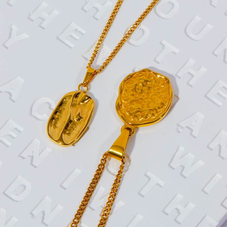 复古浮雕凹凸纹图案不规则镀18K金币项链高抛光捶打纹不锈钢饰品