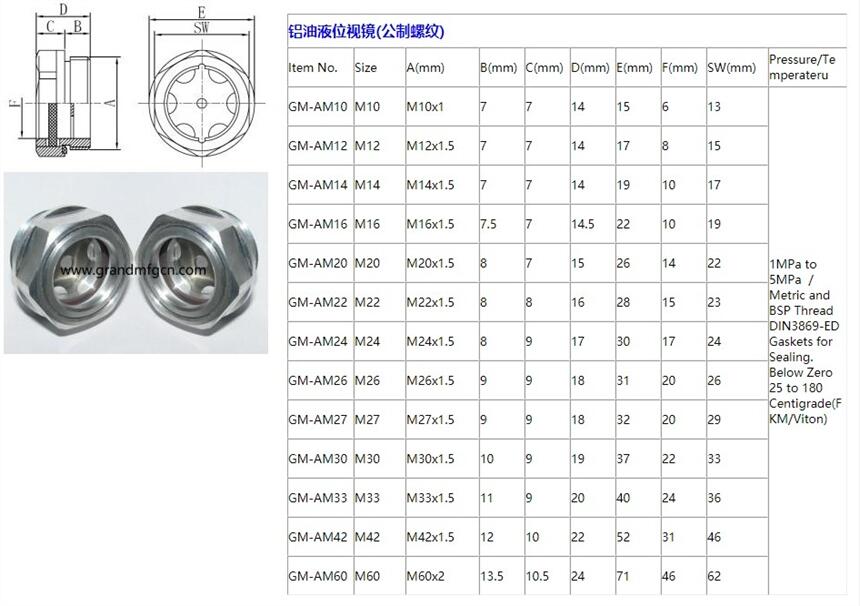 油视镜作为油标的一种,主要由透明视窗、铝合金框架、密封圈及连接螺纹等部分组成。视窗材质一般采用强化玻璃或工程塑料,确保透光清晰且抗冲击。框架采用精密铝合金铸造或挤压成型技术,提供稳定的机械强度。密封圈常用氟橡胶或丁腈橡胶以保证气密性,防止油液泄漏和空气进入。