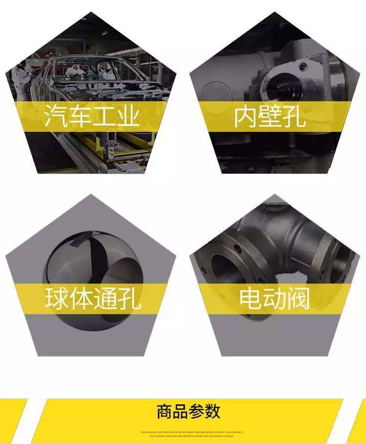 适用于多行业金属去毛刺。如:航空,汽车工业零部件、电动阀,发动机缸体,圆柱体,球体通孔,内壁孔。