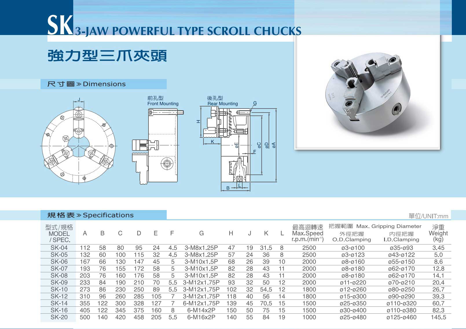 千岛手动卡盘SK-08强力型三爪手动夹头:参数