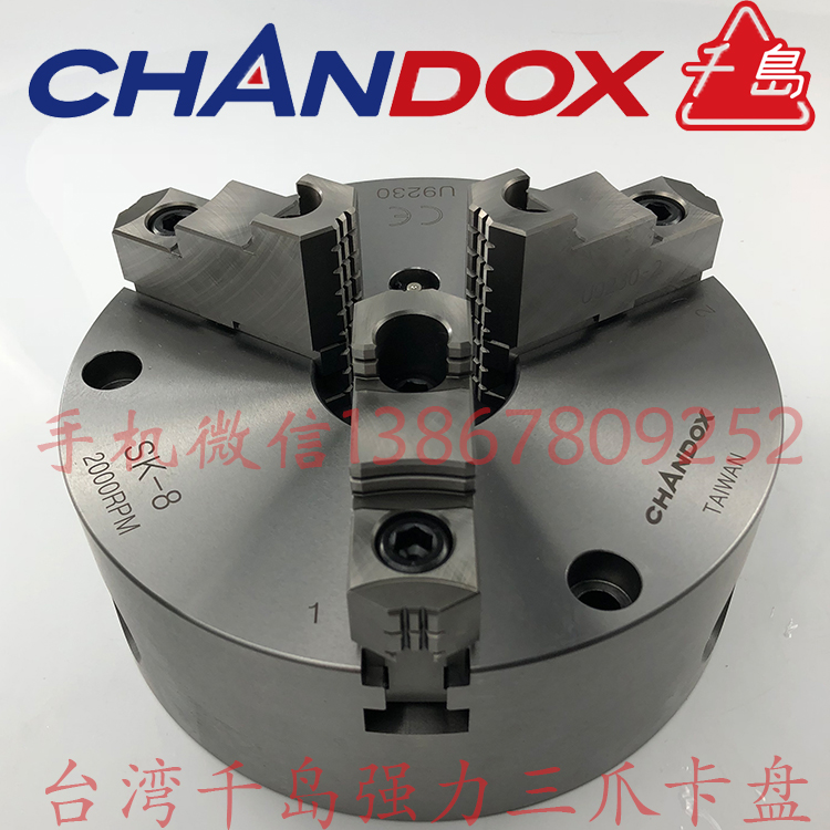 千岛手动卡盘SK-08强力型三爪手动夹头;千岛强力型三爪手动夹头由宁波台隍机电从台湾原厂直接进口,保证原厂正品行货,产品性能优越。从主爪(1的位置)调试卡盘能够调试到一个丝的加工精度,适合加工高精度的工件。卡盘采用45号钢加工而成,硬度高,耐磨性能强。连续工作8小时需要注射一次卡盘专用的润滑油(油脂溢出油嘴处为佳),使用半年后需要把卡盘分解拆开,彻底清洁一次卡盘。按时保养能更好的保持卡盘加工精度,较少磨损,延长卡盘使用寿命。台隍机电10年工程师24小时在线为您提供免费技术咨询:13867809252