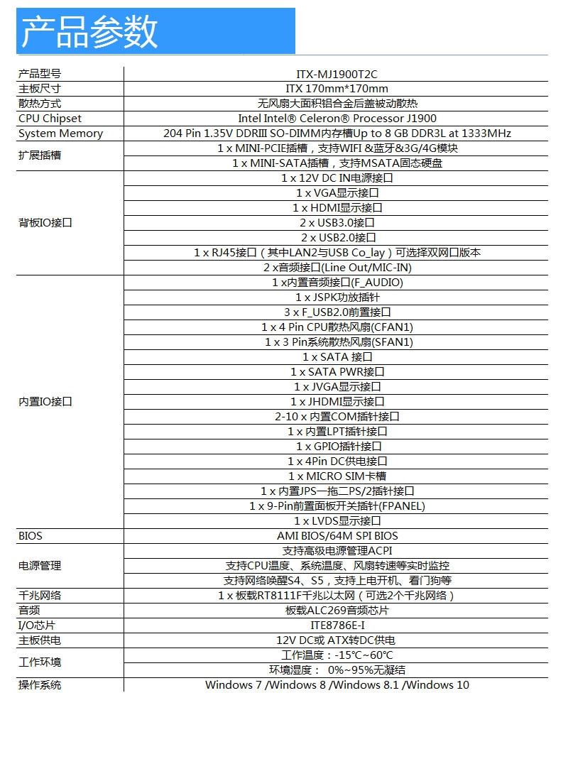 ITX-MJ1900T2C多串口数据采集工控板是一款采用Intel J1900 CPU平台开发的迷你工控板,主机板采用MiniITX板型设计,尺寸为17cmX17cm,配置了2~10个RS232串口,满足多外设数据模块接入。ITX-MJ1900T2C迷你板采用工业标准设计,-10℃~60℃宽温工作,采用12V DC直流电源输入。电子元器件,接插件均采用大品牌供应商产品,保证产品的质量和可靠性。ITX-MJ1900T2C工业控制电脑主板提供LVDS点屏,超薄设计,可用于工业平板电脑设计,提供HDMI,VGA等视频接口,可以构成异步双显或同步双显系统,产品应用于工业数据采集,生产线过程控制等场合。