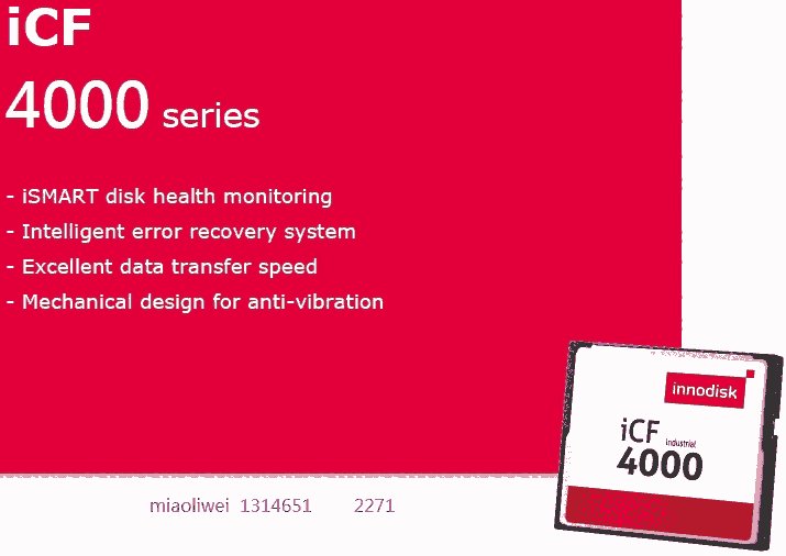 Innodisk Industrial CompactFlash?4000存储卡(iCF 4000)产品提供高容量固态闪存,在电气上符合与IDE磁盘驱动器电气兼容的真正IDE模式。原始CF形状系数卡可用于任何具有CF插槽的系统。
